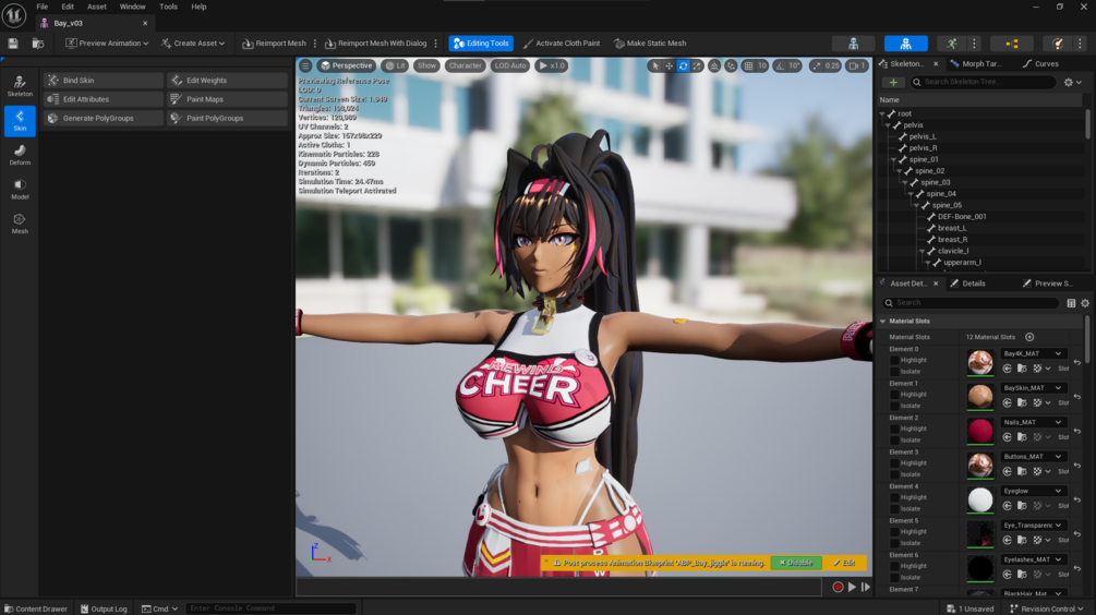 In Unreal Engine, the 3d model has basic cloth (skirt).